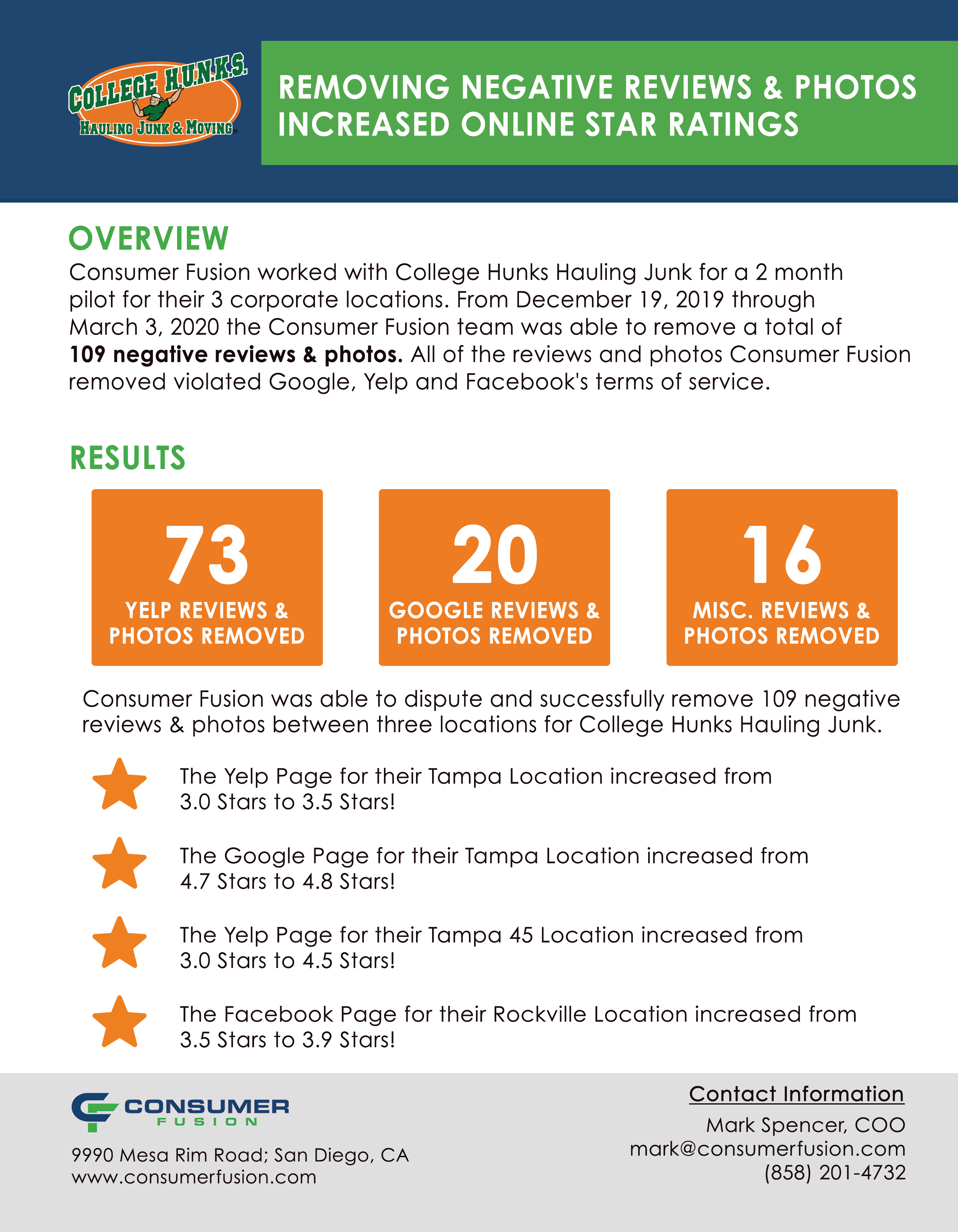 "In a business like ours, positive online reviews are critical. Many customers will look at what others say about us before inviting us into their homes during a stressful time. Since we partnered with Consumer Fusion they have greatly improved our online reputation! In just a two month pilot with 3 locations, they removed 109 negative reviews & photos and responded to hundreds of online reviews. With those results, it's easy to see why we expanded using them for the entire brand!"